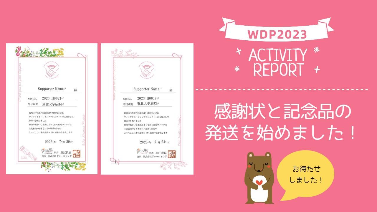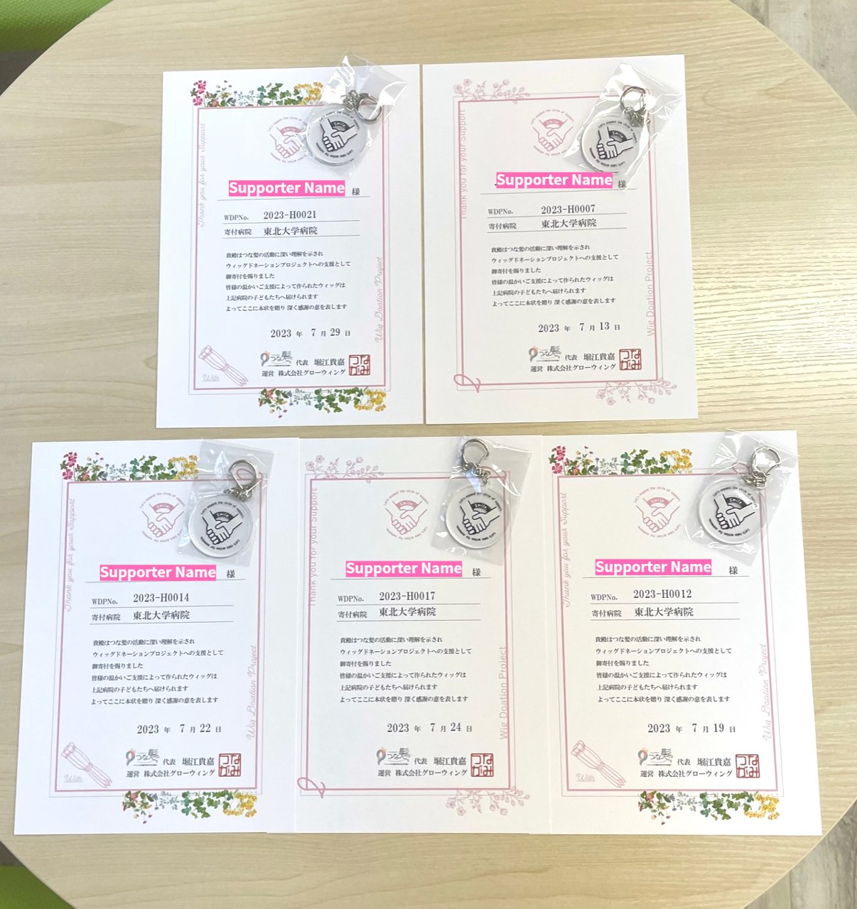つな髪WDP(ウィグドネーションプロジェクト)では、寄付金に合わせて感謝状と記念品をお届けしています。