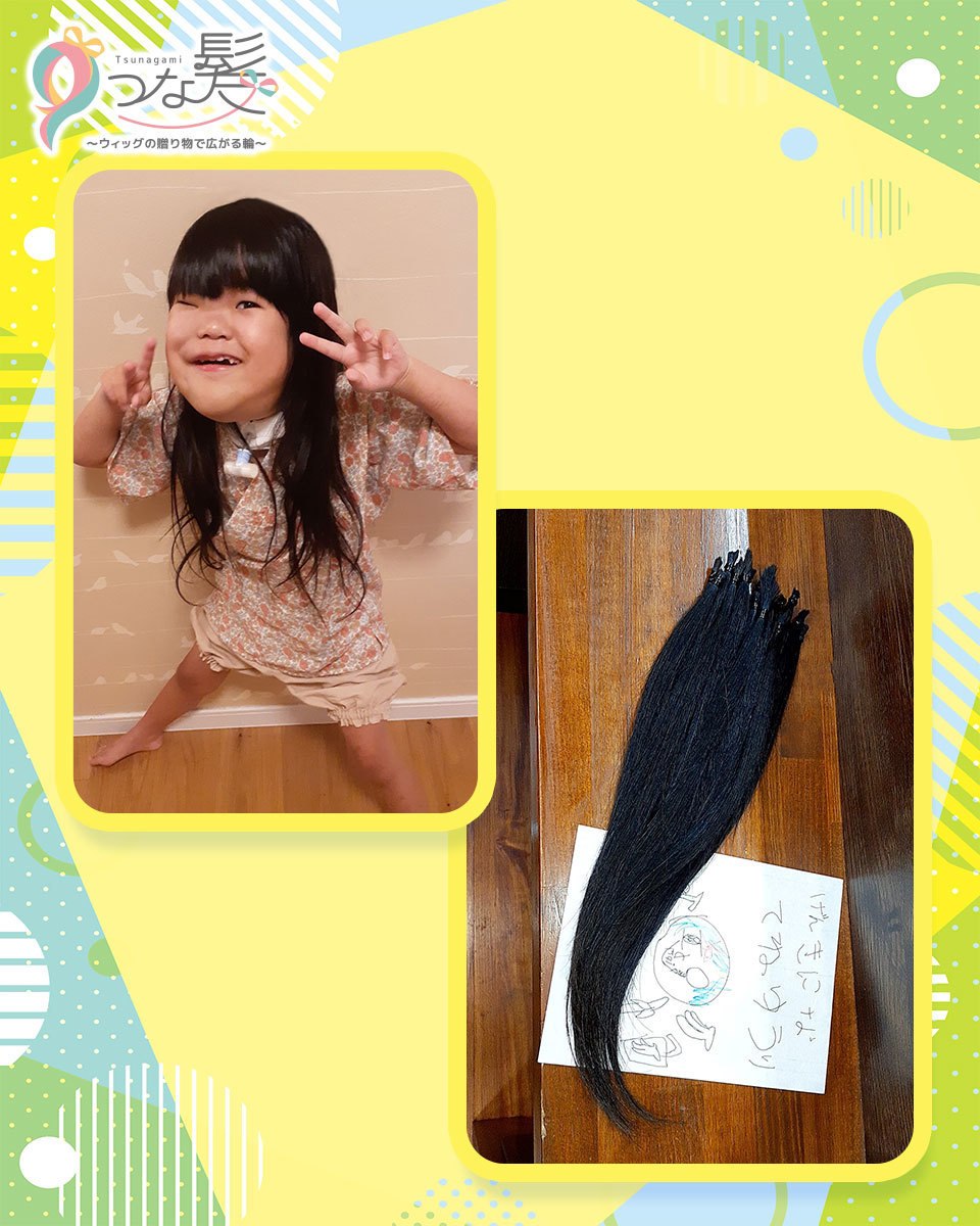 いつも頑張ってる難病の娘が9歳のお誕生日にヘアドネーションをさせていただきました。彼女自身も免疫抑制剤の副作用で入退院を繰り返してます。同じように頑張ってるお友達のためにヘアドネーションすると言って頑張って伸ばし寄付させていただきました。助け合いの精神でこれからも強く優しく生きてほしいです。 - 川口 桃果 様