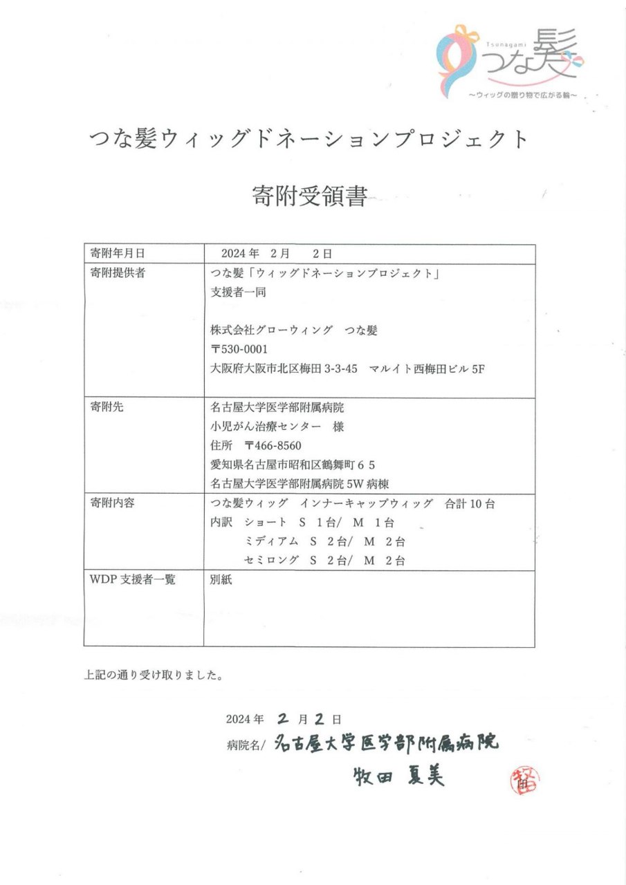 ウィッグ寄附明細書:名古屋大学医学部附属病院
