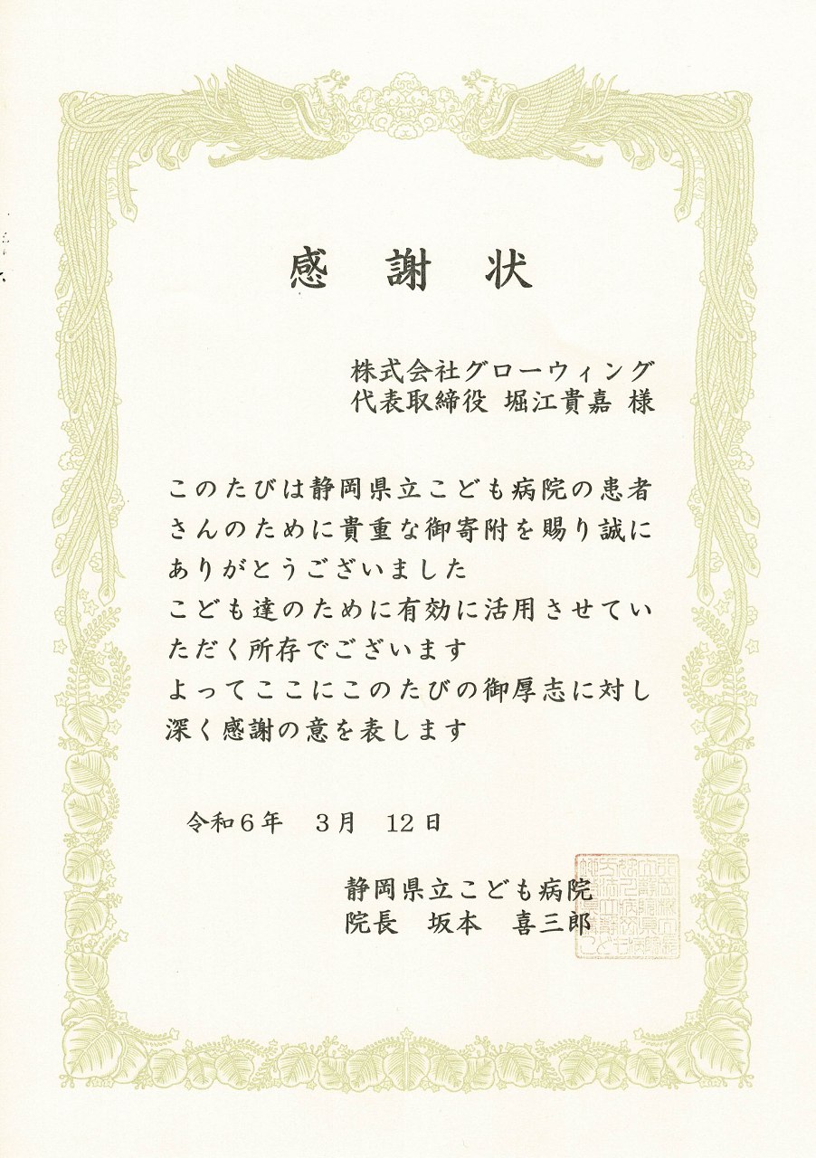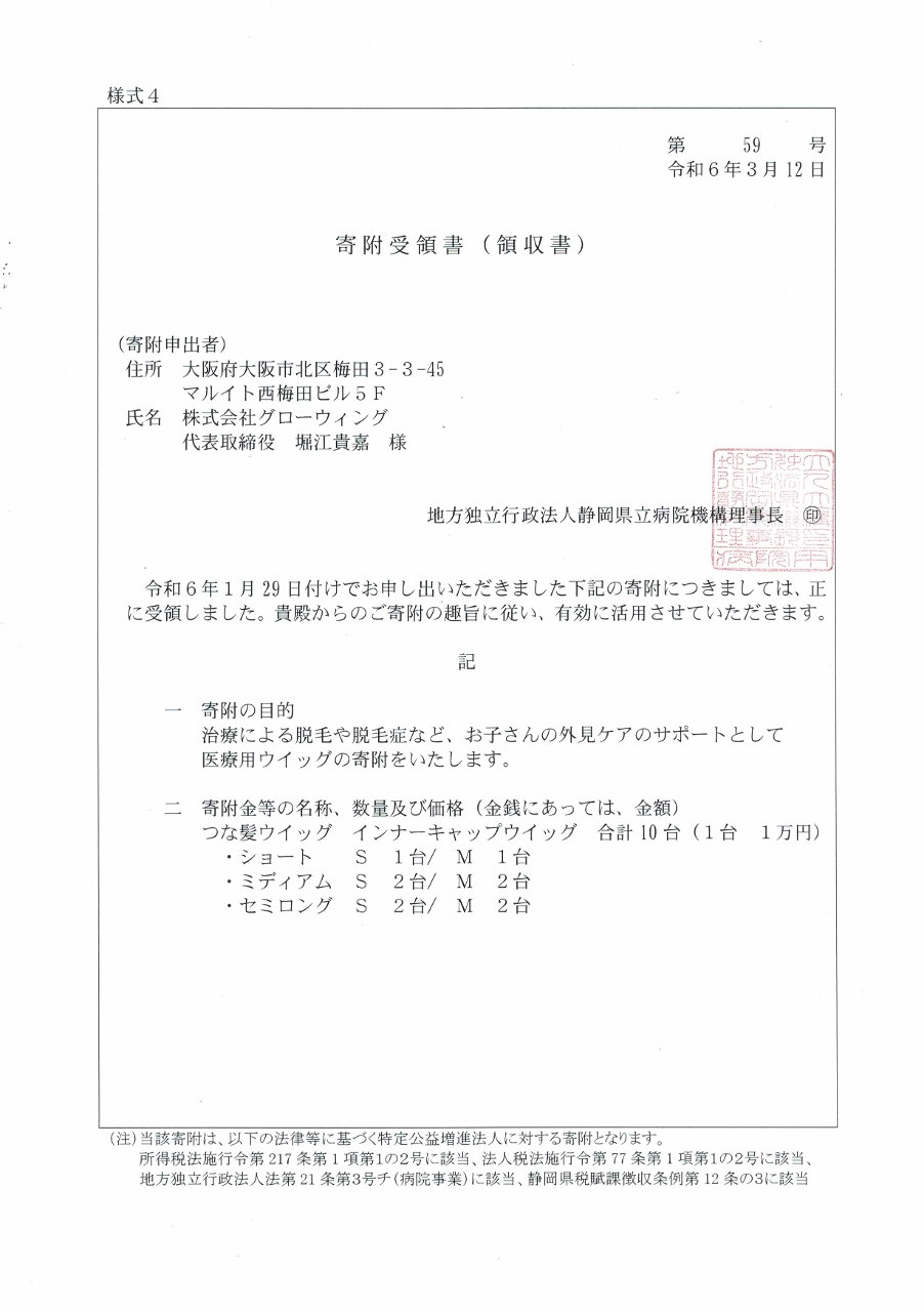ウィッグ 寄附受領書:静岡県立こども病院