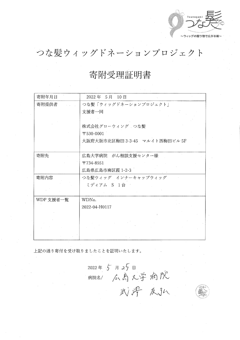 寄附受領証明書:広島大学病院様