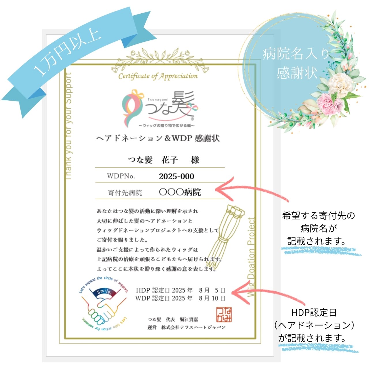 寄付金でのご支援の方は「病院名」と「WDP認定日」が記載された感謝状を、ヘアドネーションにもご協力いただいた方にはヘアドネーション(HDP)認定日が記載された感謝状を贈呈しています。