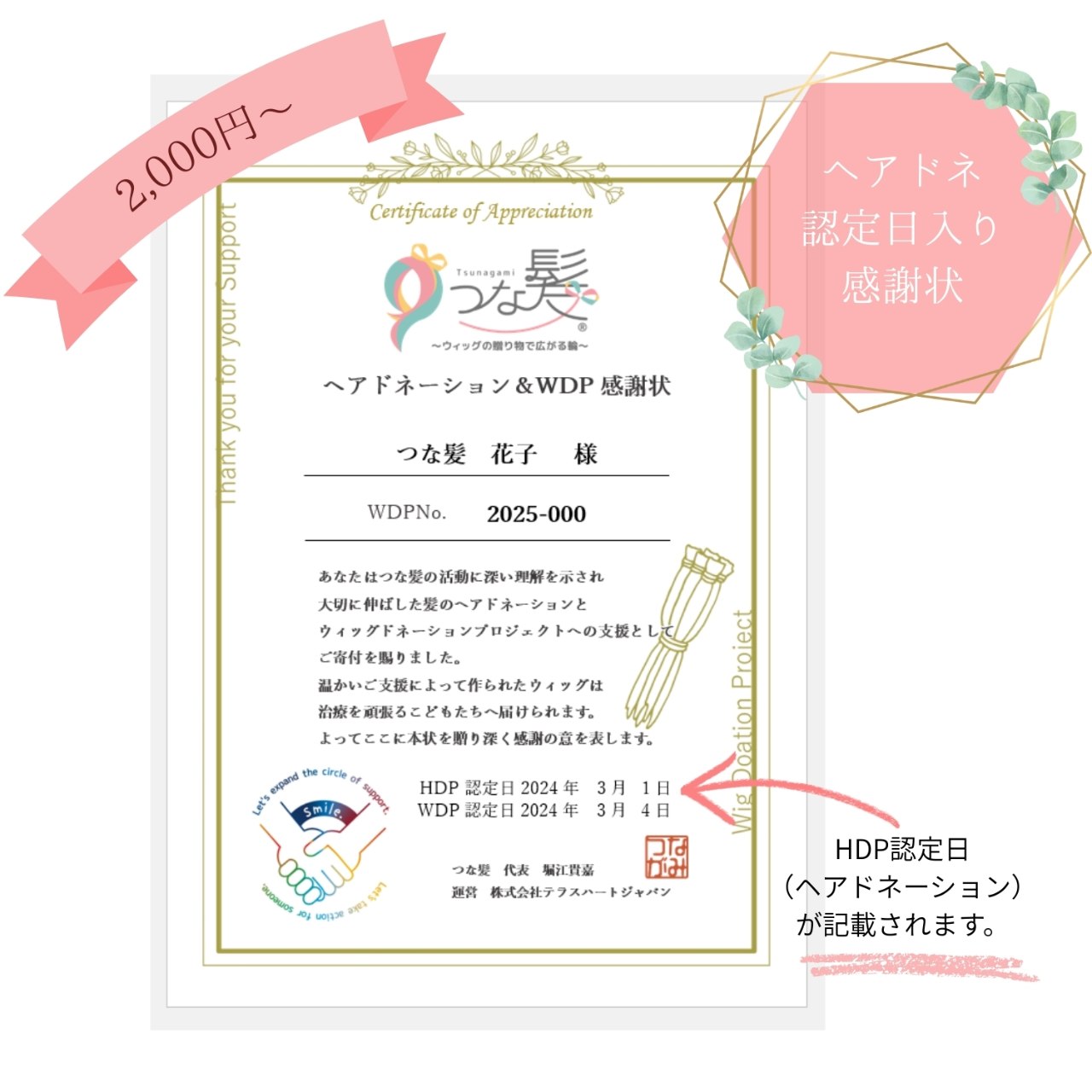 2,000円からのご寄付の方にはウィッグドネーションプロジェクト番号と認定日が記載された感謝状を贈呈させていただきます。