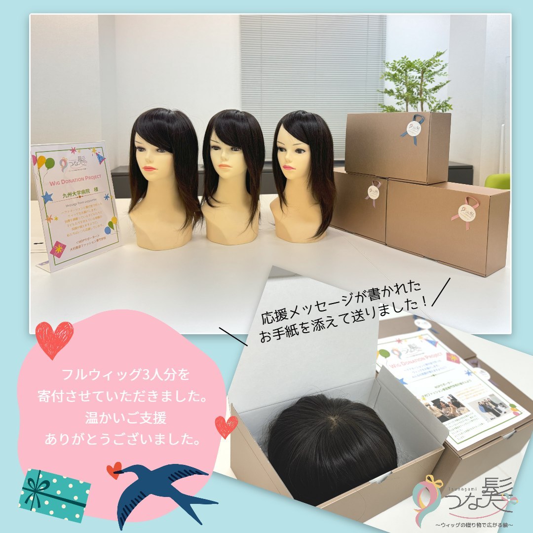 病院によると、15歳までしかウィッグ支援が受けられない企業団体があり、そういう子どもたちにお渡しできるウィッグがあるとありがたいとのことで、今回はMサイズ3台とLサイズ2台をご用意させていただきました。