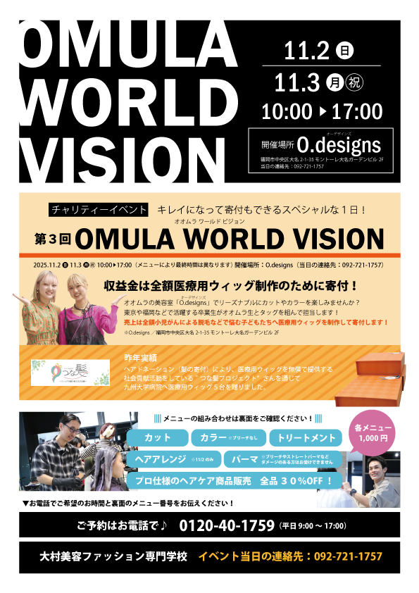 東京や福岡で活躍している卒業生と大村美容ファッション専門学校の学生さんたちがタッグを組んで、カットやヘアカラー、トリートメントなどの技術を格安で提供し、収益金を病気などで髪を失った子どもたちのために医療用ウィッグにして寄付するイベントです。