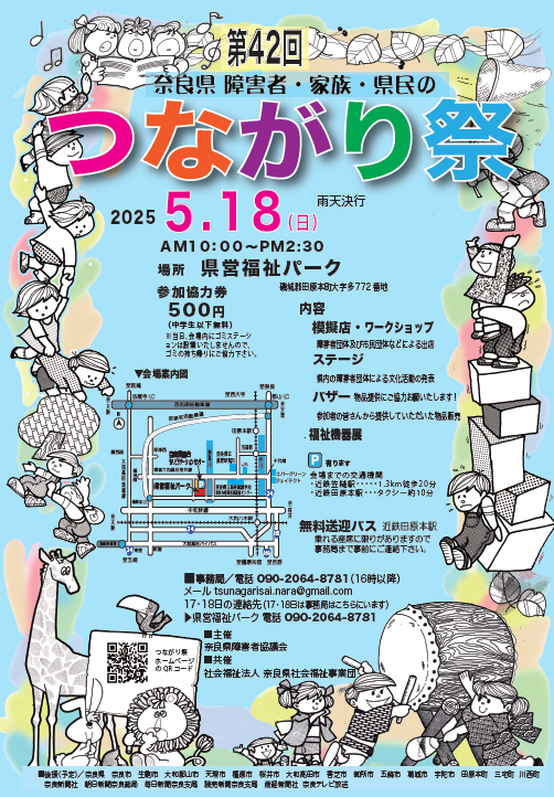 世界各国における障害者の人権を守る運動がすすむ中で、国際連合が1981年を「国際障害者年」と定め、『障害者の権利宣言』の実現を目指して、各国政府が長期計画をもって障害者対策に取り組むよう提言しました。以後、「奈良県障害者・家族・県民のつながり祭」として毎年5月に開催しています。参加団体は約50団体で、ステージでの発表、模擬店、ワークショップやバザーなどのとりくみがあります。