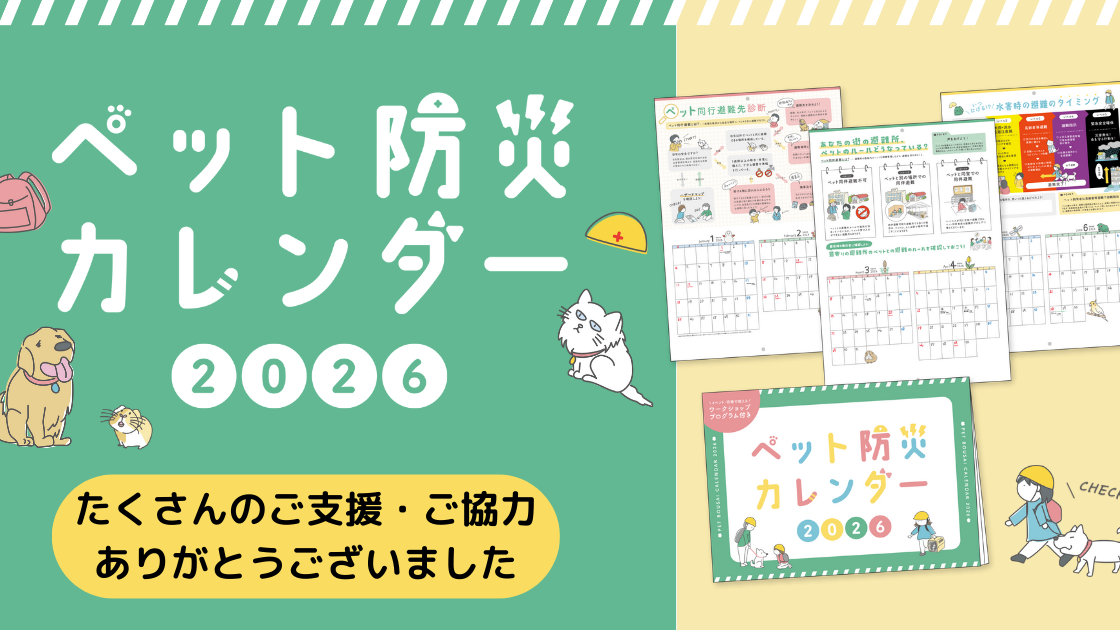2026-02-01 16:48【ペット防災カレンダープロジェクト2026】お礼とご報告この度は、 ペット防災カレンダー配布応援プロジェクト2026にご協力いただき、誠にありがとうございました。 おかげさまで、 支援総額 1,277,300円、224名もの方から温かいご支援をいただくことができました。 全国から寄せられたたくさんの応援に、関係者一同、大きな励ましと力をいただいております。心より感謝申し上げます。 また今回のプロジェクトでは、 「毎年配っていたら、今年は地域の避難訓練やイベントに声をかけてもらった」 といった嬉しいお声も届きました。 みなさまのご支援とご協力が、この取り組みを続けていく大きな力になっていることを、改めて実感しております。 今後も、人とペットが一緒に安全に避難できる社会を目指し、活動を続けてまいります。 引き続き、あたたかく見守っていただけましたら幸いです。 本当にありがとうございました。2026-02-01 16:48【ペット防災カレンダープロジェクト2026】お礼とご報告この度は、 ペット防災カレンダー配布応援プロジェクト2026にご協力いただき、誠にありがとうございました。 おかげさまで、 支援総額 1,277,300円、224名もの方から温かいご支援をいただくことができました。 全国から寄せられたたくさんの応援に、関係者一同、大きな励ましと力をいただいております。心より感謝申し上げます。 また今回のプロジェクトでは、 「毎年配っていたら、今年は地域の避難訓練やイベントに声をかけてもらった」 といった嬉しいお声も届きました。 みなさまのご支援とご協力が、この取り組みを続けていく大きな力になっていることを、改めて実感しております。 今後も、人とペットが一緒に安全に避難できる社会を目指し、活動を続けてまいります。 引き続き、あたたかく見守っていただけましたら幸いです。 本当にありがとうございました。