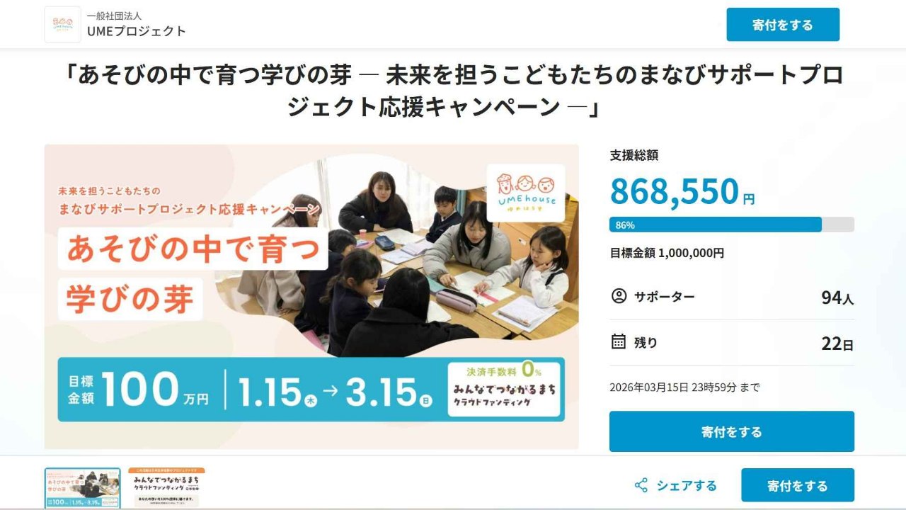皆様のご支援・ご協力のもと、目標金額の86%まで達成しました。 温かいメッセージもたくさんいただき、本当にありがたいです。 毎週、学生チームとMTGを重ねながら、すすめております。 引き続き、目標達成まで、チーム一丸となって頑張ります! 引き続き、ご支援・ご協力をお願い致します!