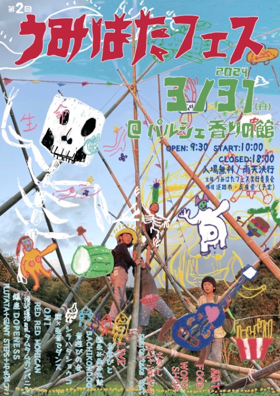 うみはたフェスはこの世にあるたくさんの文化や価値観、いろんな「違い」を感じてもらいながら、音楽や踊り、食べ物や作品などを通して、愉快な芸術家たちと共に遊ぶお祭りです。 会場の「パルシェ 香りの館・香りの湯」は、空と海の境界線が見え、たくさんの植物が育っています。この日は、みんなで作った旗や、遊びにきた人で創られる空間アートの風船が風に吹かれながら​そ植物達と共に祭りを見守ってくれます。 ​