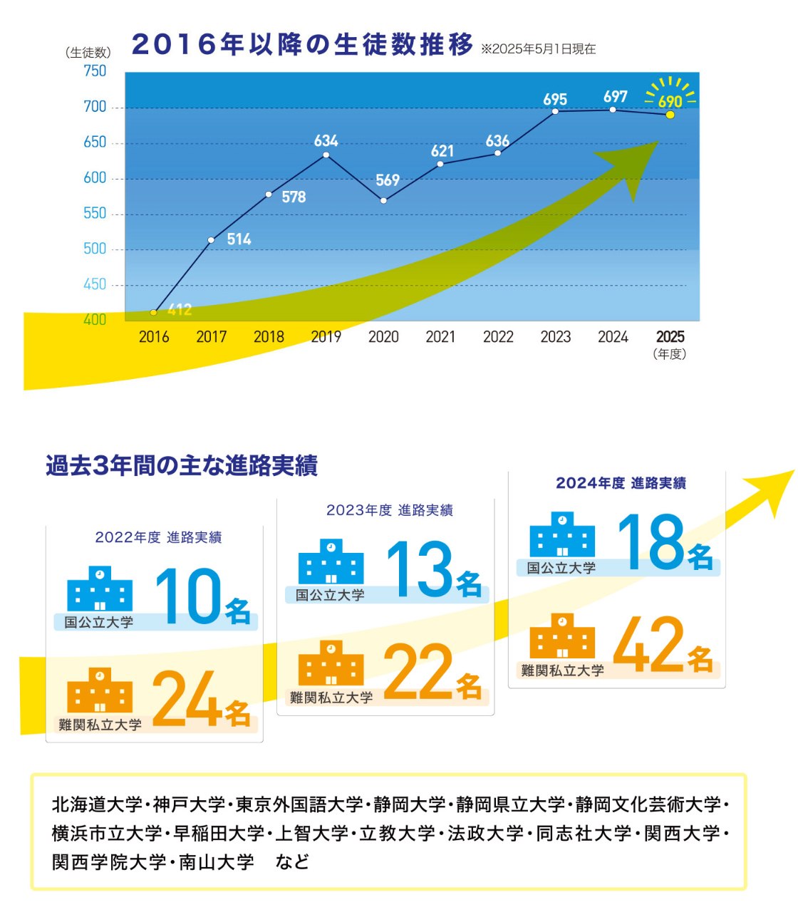 平成29年(2017年)の共学化および校名変更以来、本校の生徒数は年々着実に増加し、発展を続けています。伝統ある英語や国際教養教育に加え、令和5年(2023年)には理数コースを新設し、理数教育にも力を入れています。その結果、生徒の学力は年々向上し、国公立大学や難関私立大学への合格者数も増加しています。さらに、吹奏楽部や陸上競技部などの部活動も盛んで、全国大会に出場するなど、生徒たちは多岐にわたる分野で活躍しています。