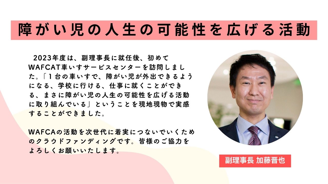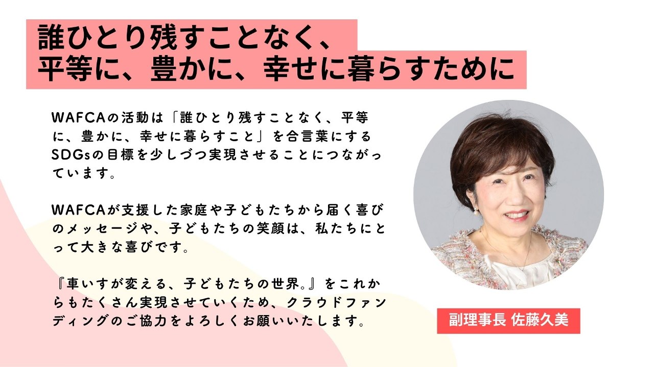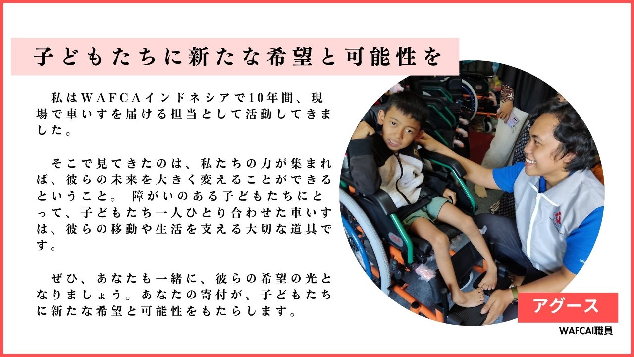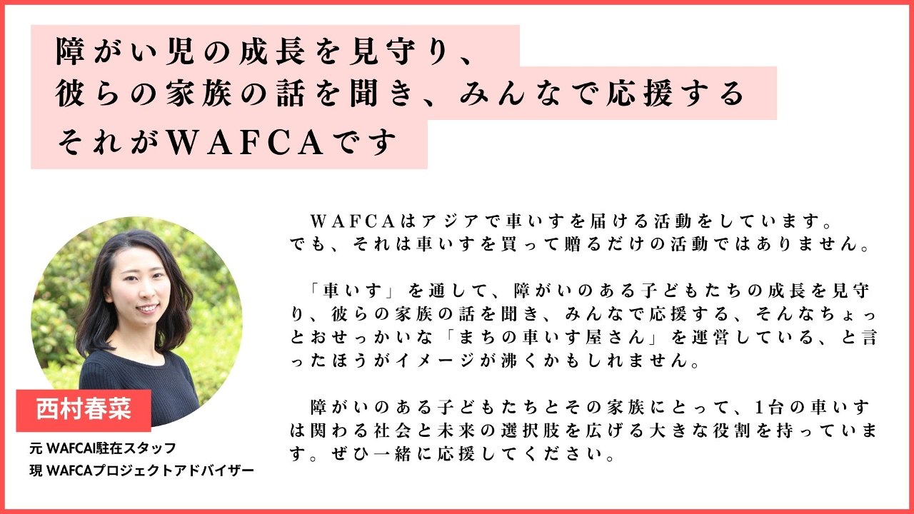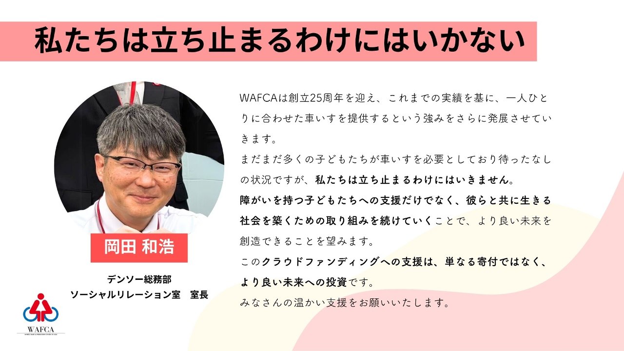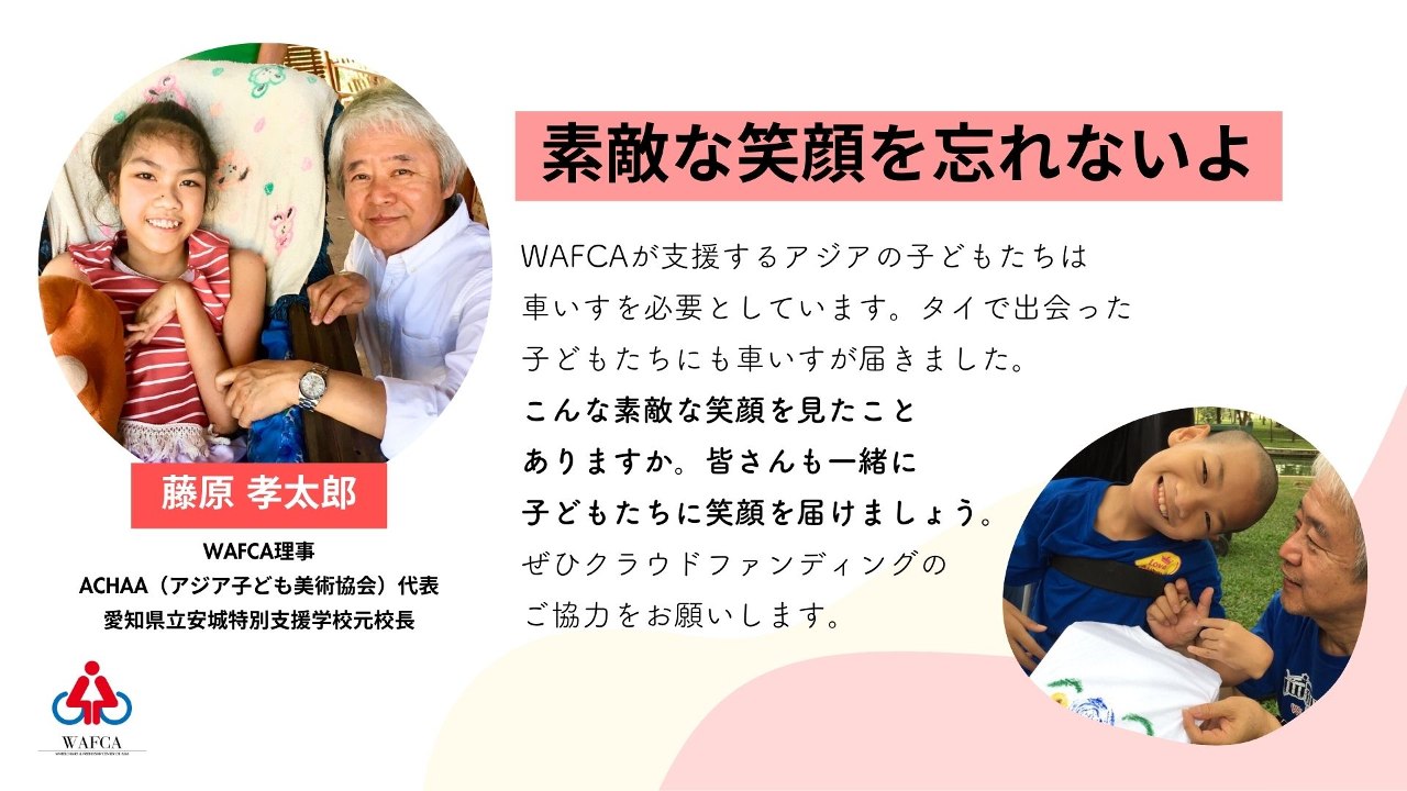1人ひとりに合った車いすを提供してきたWAFCAが、この先も、車いすを待つ子どもたちに希望の1台を届けられるよう、どうか力を貸してください。