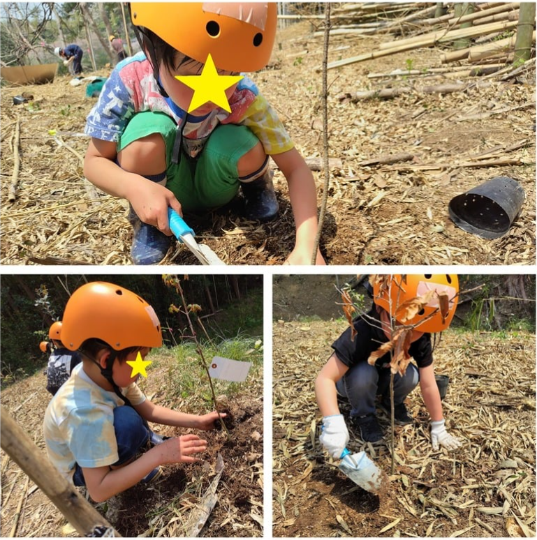 「固いからできない。」「無理」ではなく、周りを見て、仲間を頼ったり、手を差し伸べたりを自発的にする姿が見られ、ほぼ子どもたちの力だけで植樹作業を完遂しました👏