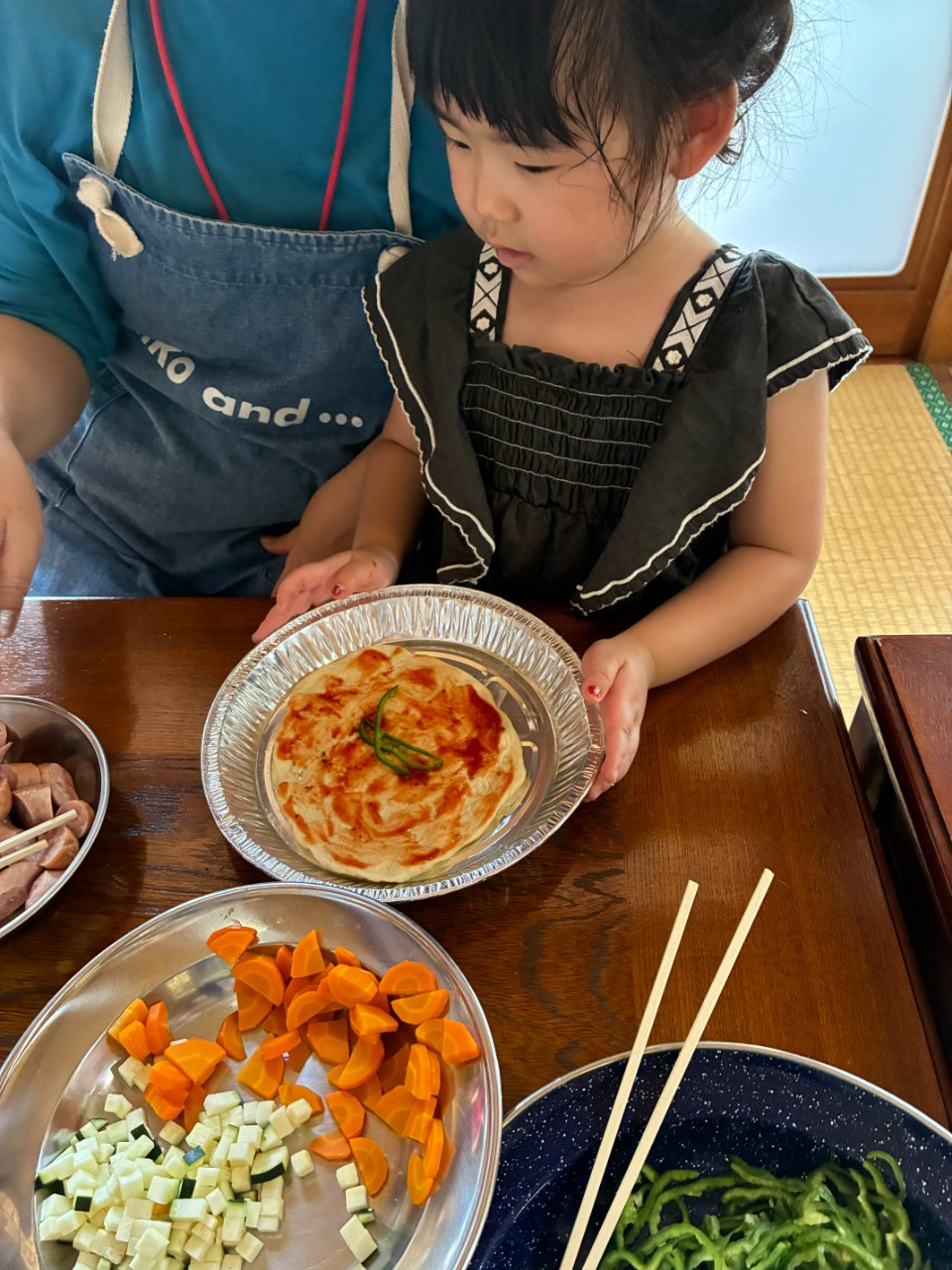 おじいちゃん、お母さんと一緒に来てくれた近所に住む小さな兄妹。何を乗せようかと真剣に選んでいます🍕