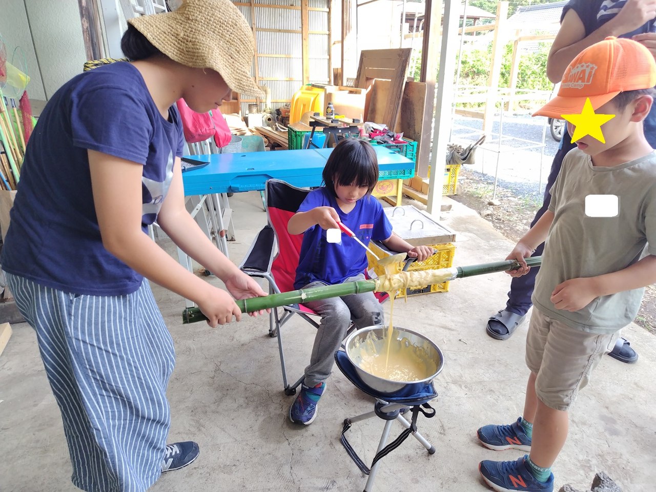野外炊飯で、竹に巻き付けるバームクーヘンにチャレンジをしましたが、最後の最後でスローモーションのように火の中に崩れ落ちていき……失敗!!💦