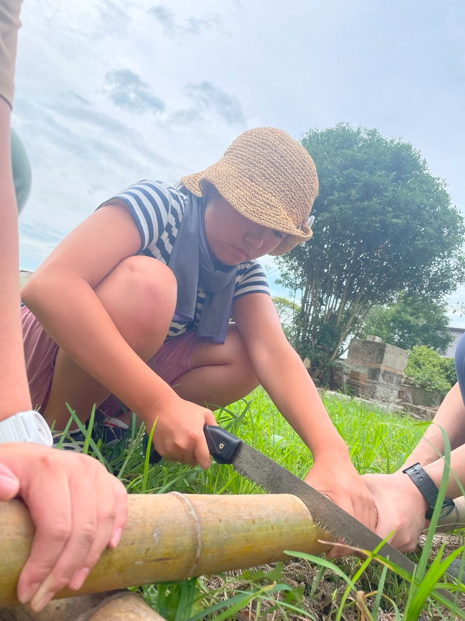 裏の竹やぶから切り出した竹で流しそうめんの準備です☆一人一人自分のお椀を用意します。