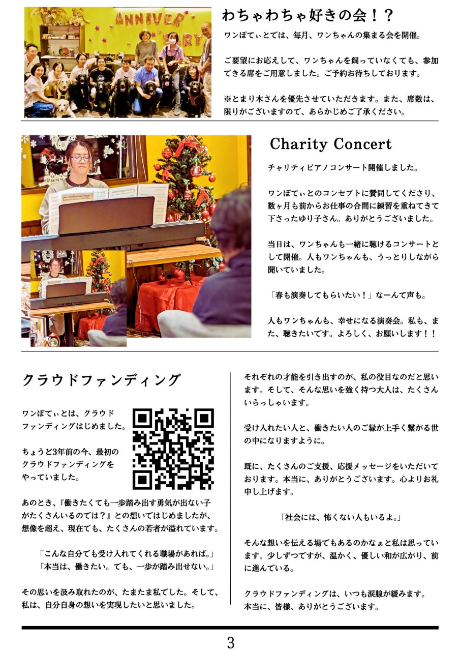 月に1回、その月にワンぽてぃとで起きた出来事を掲載した「とまり木新聞」を発行しています。