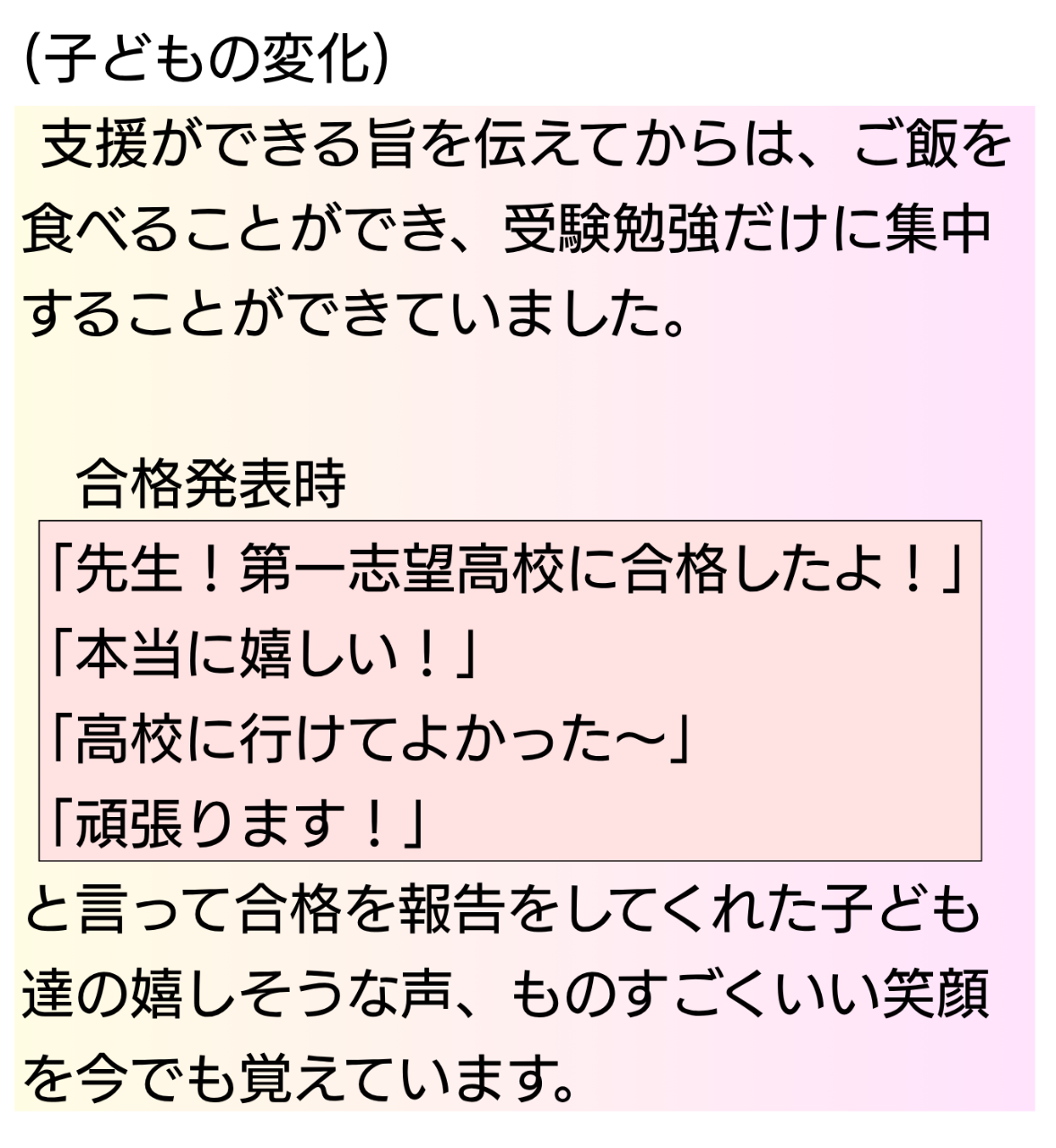 10年以上支援をしていくなかで、学力や目標があるにも関わらず、経済的理由により高校進学を諦める子ども達を何人も見てきました。