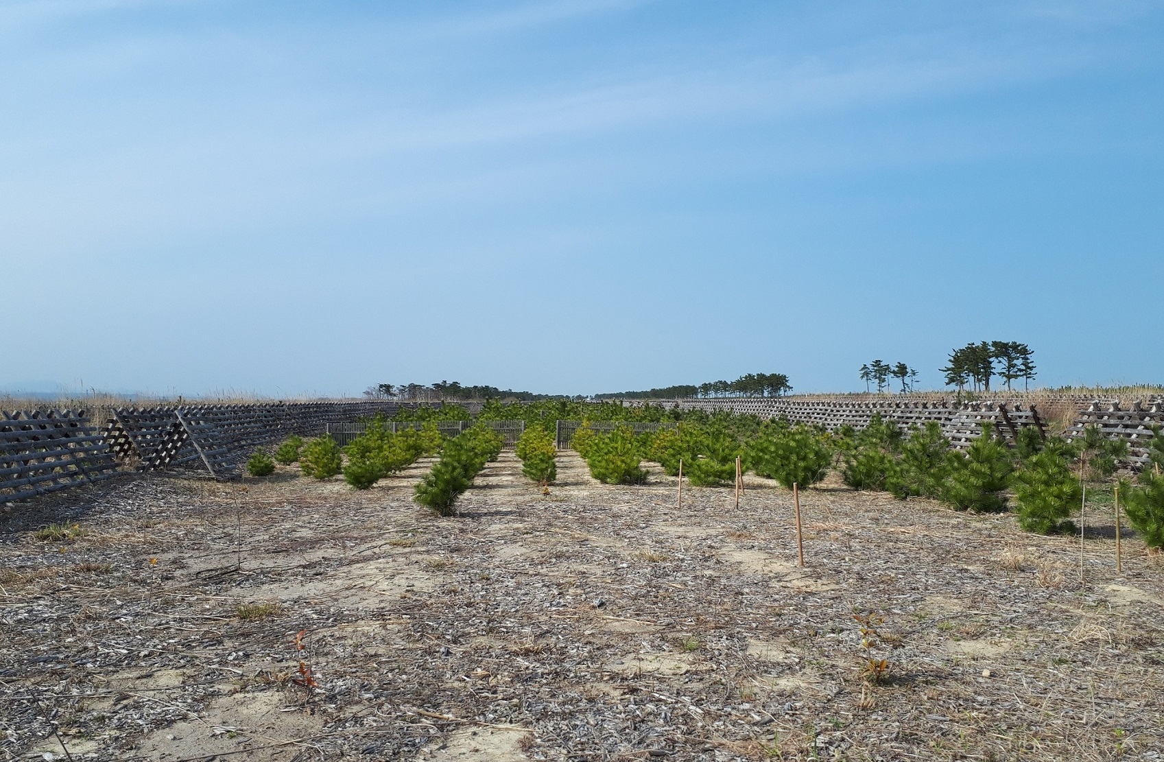 植樹地に植えたクロマツが、防潮林としての役割を果たせる高さ(約15m)になるまで、早くても20年はかかると言われています。さらに「海岸林が復活した」と言えるようになるのは、それからきっと何十年も先のこと。その間、森を構成する木々の生育を助けるため、人の手で継続的な管理をしていかなければなりません。