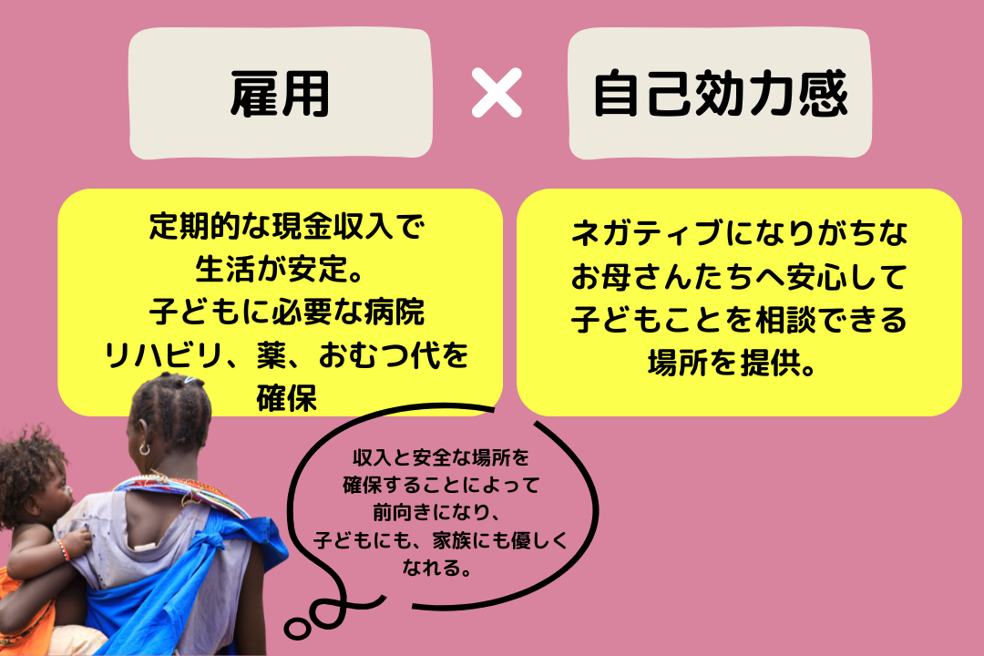Pamoja na Africaは、「障害を理由に捨てられる子どもをゼロにする」を目標に、活動しています。そのために、ソーシャルビジネスを通して収入向上を目指しています。①安定した雇用、②自己効力感の向上を通して、家族の環境を変えていきます。