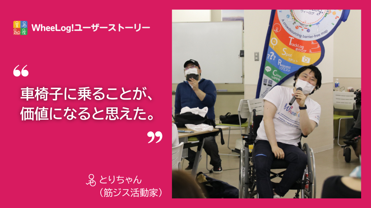 2025-11-26 15:00【ユーザーストーリー】車いすに乗ることが“価値”になった日──とりちゃんの言葉車いすに乗ることを前向きに選べたのは、WheeLog!と仲間たちとの出会いがあったから——。 筋ジス活動家のとりちゃんは、バリアフリー情報をみんなで投稿し合うこの仕組みが、人の外出を支え、やさしい社会を広げていく力になると話してくれました。街歩きやコミュニティの温かさにも触れ、「車いすでもあきらめない世界を一緒に」と呼びかけています。 ★認定NPO法人取得記念★サポーター募集中!寄付キャンペーン 11/30まで WheeLog!の無料アプリの運営を続けるため、継続寄付サポーターを募集しています。2025-11-26 15:00【ユーザーストーリー】車いすに乗ることが“価値”になった日──とりちゃんの言葉車いすに乗ることを前向きに選べたのは、WheeLog!と仲間たちとの出会いがあったから——。 筋ジス活動家のとりちゃんは、バリアフリー情報をみんなで投稿し合うこの仕組みが、人の外出を支え、やさしい社会を広げていく力になると話してくれました。街歩きやコミュニティの温かさにも触れ、「車いすでもあきらめない世界を一緒に」と呼びかけています。 ★認定NPO法人取得記念★サポーター募集中!寄付キャンペーン 11/30まで WheeLog!の無料アプリの運営を続けるため、継続寄付サポーターを募集しています。
