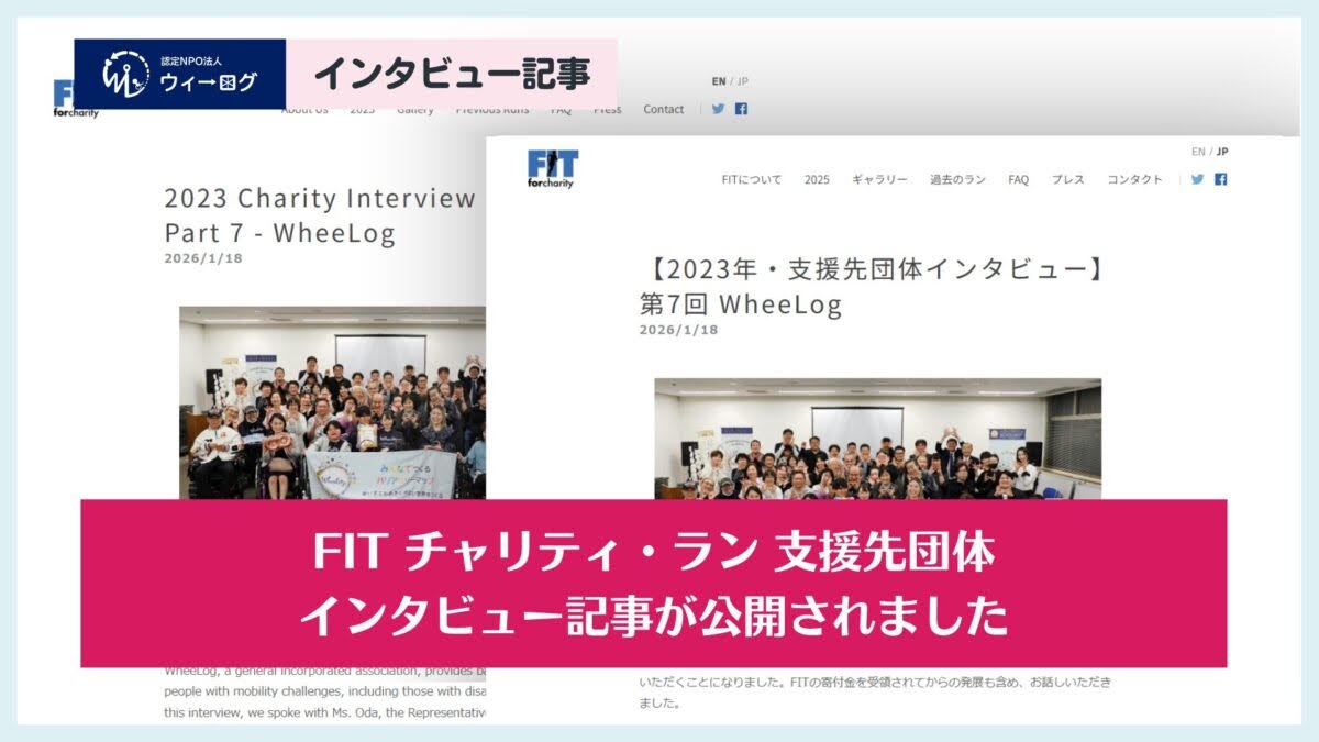 | 【掲載のお知らせ】FIT チャリティ・ラン インタビュー記事が公開されました FITチャリティ・ランの取り組みを通じて、WheeLog!の活動背景や目指す社会について紹介いただきました。スポーツと社会貢献が交差する文脈で、活動の意義が伝えられています。 詳細はこちら |