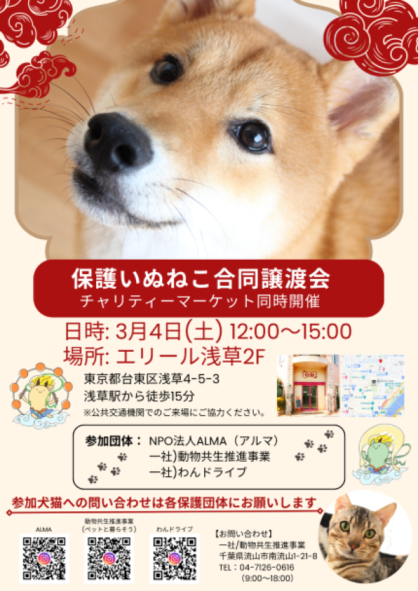 2023-02-24 23:50合同譲渡会開催が決まりました!!コロナ禍中になかなか出来なかった譲渡会ですが、今年度はようやく各地で開催が出来るようになってきたのでほぼ毎週のように週末はいずれかで譲渡会を行っています(*^-^*) 準備や移動はなかなか大変ではありますが、少しでも多くの方に保護犬猫活動を知っていただける良い機会なので時間がある限り開催できたらなと思っています。 来週は念願だった複数団体による合同譲渡会を浅草で行います。 15頭~20頭の犬猫が集まりますのでご都合がつく方はぜひ可愛い犬猫たちに会いに来てあげたくださいね♪ 素敵なご縁に繋がりますように...2023-02-24 23:50合同譲渡会開催が決まりました!!コロナ禍中になかなか出来なかった譲渡会ですが、今年度はようやく各地で開催が出来るようになってきたのでほぼ毎週のように週末はいずれかで譲渡会を行っています(*^-^*) 準備や移動はなかなか大変ではありますが、少しでも多くの方に保護犬猫活動を知っていただける良い機会なので時間がある限り開催できたらなと思っています。 来週は念願だった複数団体による合同譲渡会を浅草で行います。 15頭~20頭の犬猫が集まりますのでご都合がつく方はぜひ可愛い犬猫たちに会いに来てあげたくださいね♪ 素敵なご縁に繋がりますように...
