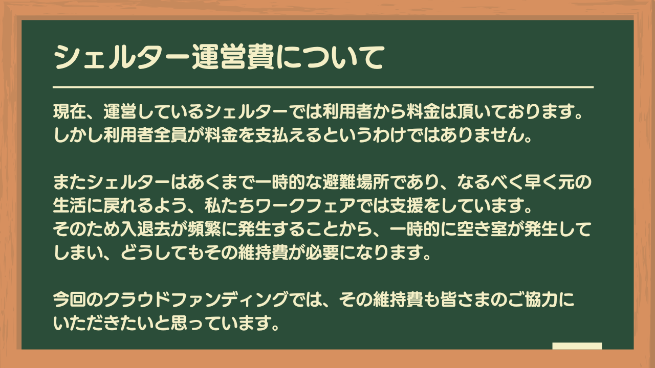 ● 現在、私たちワークフェアでは民間アパート、公営住宅を借りており、いつでも利用できるよう、シェルターとして空き室を数部屋維持しています。そのため維持管理の費用が大きな負担になっています。