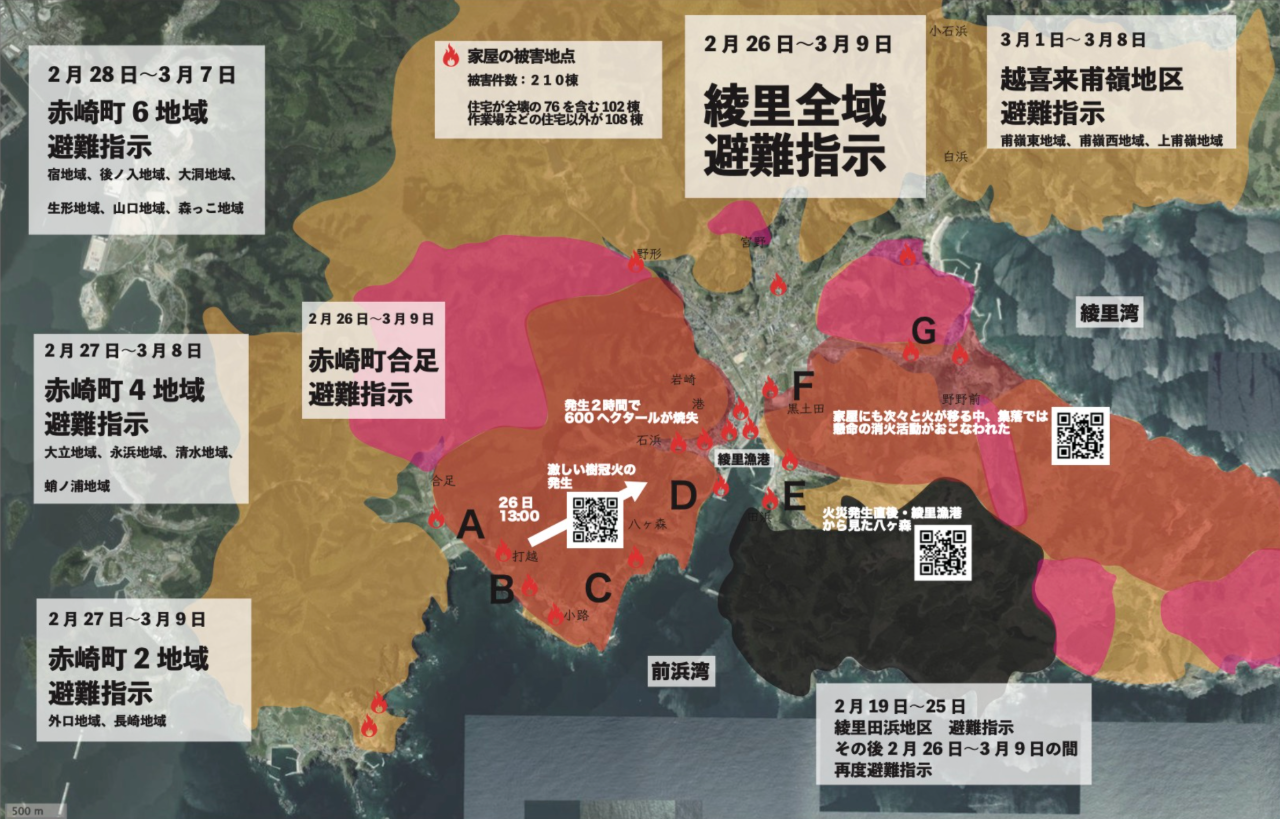 オレンジが火災から2時間で燃えた範囲、ピンクは1日目に燃えた範囲、黄色が延焼範囲全体。紫部分は、2月19日に発生した火災の範囲(2月に大船渡では2つの山火事が発生しました)資料の詳細はこちら
