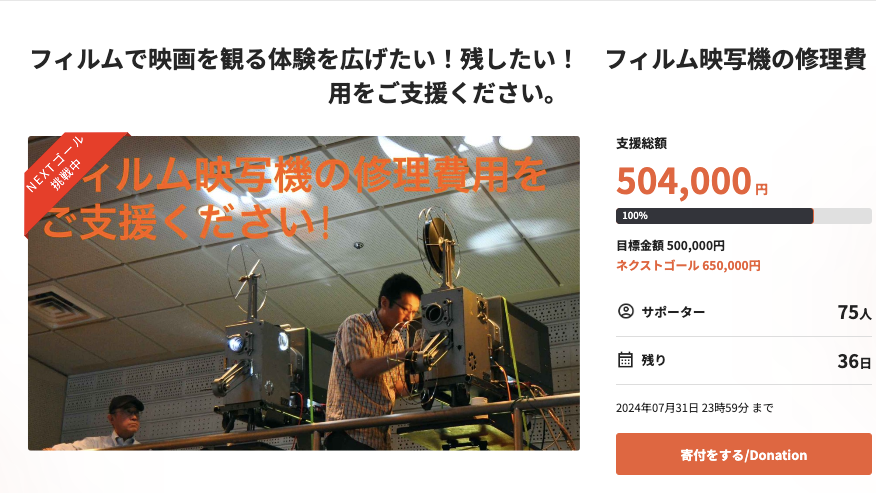 2024-07-16 13:11【目標達成】ネクストゴール650,000円も達成しました!本日、ネクストゴールの目標金額650,000円を達成したしました!ご協力いただきました皆様、本当にありがとうございます! クラウドファンディング期間はまだ15日残っていますので、このまま寄付の受付は継続し、集まった金額に応じてフィルム映写機を使った映写技師のワークショップ&無料上映会を複数回開催したいと考えています。2024-07-16 13:11【目標達成】ネクストゴール650,000円も達成しました!本日、ネクストゴールの目標金額650,000円を達成したしました!ご協力いただきました皆様、本当にありがとうございます! クラウドファンディング期間はまだ15日残っていますので、このまま寄付の受付は継続し、集まった金額に応じてフィルム映写機を使った映写技師のワークショップ&無料上映会を複数回開催したいと考えています。
