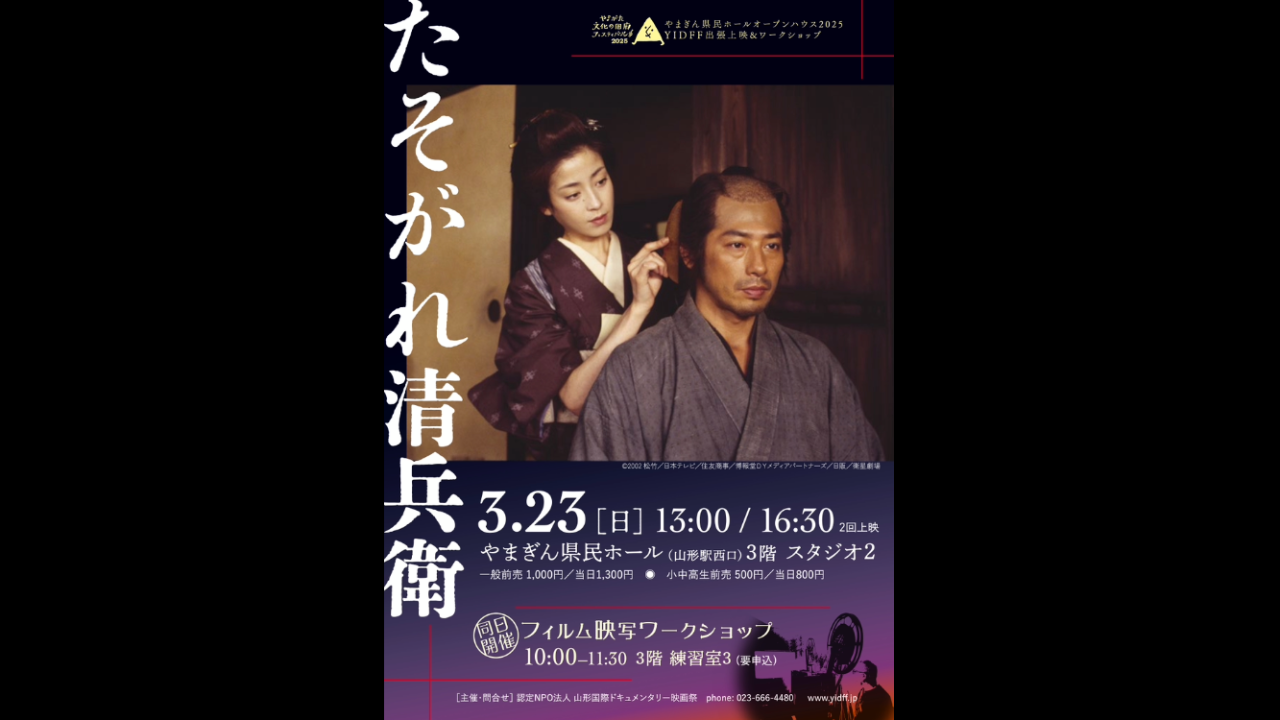 2025-02-15 09:003/23(日)映画「たそがれ清兵衛」をフィルム上映します!3月23日(日)やまぎん県民ホールのオープンハウス企画のひとつとして、フィルム映写機を使った企画(ワークショップとフィルム作品の上映)を実施することになりました。久しぶりに皆様に活動のご報告ができることを嬉しく思っております!ご都合がよろしければ是非ご参加ください。 ※クラウドファンディングの返礼品の「YIDFF招待券」が使用できる上映会となります2025-02-15 09:003/23(日)映画「たそがれ清兵衛」をフィルム上映します!3月23日(日)やまぎん県民ホールのオープンハウス企画のひとつとして、フィルム映写機を使った企画(ワークショップとフィルム作品の上映)を実施することになりました。久しぶりに皆様に活動のご報告ができることを嬉しく思っております!ご都合がよろしければ是非ご参加ください。 ※クラウドファンディングの返礼品の「YIDFF招待券」が使用できる上映会となります