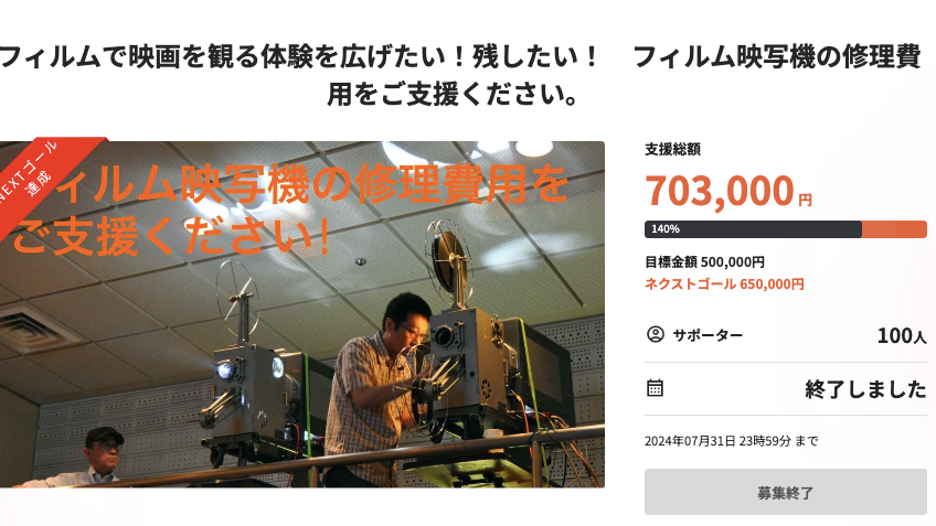 2024-08-01 14:55クラウドファンディング期間が終了しました。ご協力ありがとうございました!7月31日(水)をもって映写機メンテナンスの費用に関するクラウドファンディングプロジェクトが終了しました。 合計703,000円、100名の方にご支援いただくことができました。 ご協力いただいたみなさま、本当にありがとうございました。2024-08-01 14:55クラウドファンディング期間が終了しました。ご協力ありがとうございました!7月31日(水)をもって映写機メンテナンスの費用に関するクラウドファンディングプロジェクトが終了しました。 合計703,000円、100名の方にご支援いただくことができました。 ご協力いただいたみなさま、本当にありがとうございました。