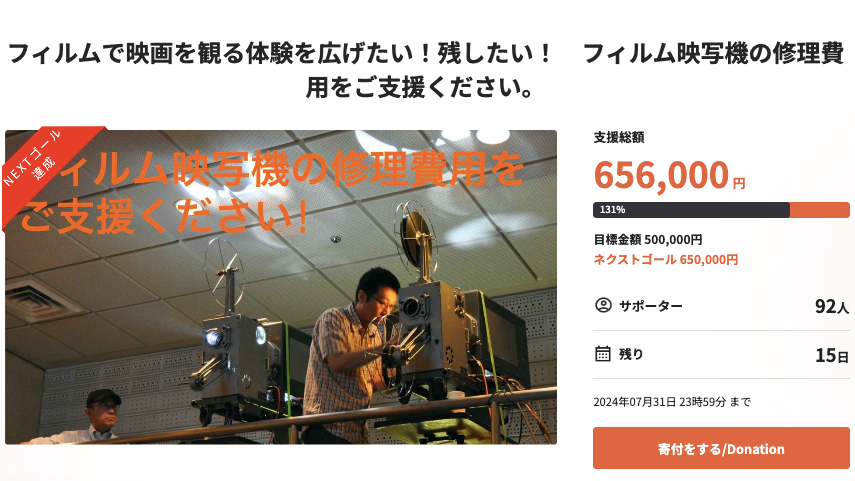 本日7/16(火)現在、656,000円の寄付が集まりました。ご協力いただき本当にありがとうございました。クラウドファンディングの挑戦期間の中で余裕を持って達成できたことは本当に驚きであり、また92名もの方に参加していただけたことが本当に本当に嬉しく、スタッフ一同感激しています。また同時に、皆さんの「フィルム映写」への熱い想いを引き受けることのプレッシャーも少し感じています。