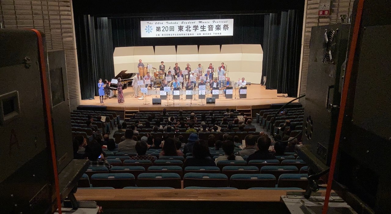 ステージ上には映画に登場した「第20回東北学生音楽祭」の看板が掲げられ、ビッグバンド「Swing Friends Jazz Orchestra+SOLA & 山口れお」の演奏も行われました。10年ぶりの「音楽祭」開催に合わせて、メンバーが各地から集結したそうです。