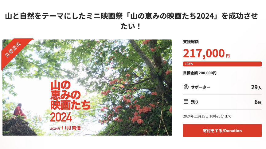 「山の恵みの映画たち2024」開催費用に関するクラウドファンディングが、ついに目標達成いたしました!