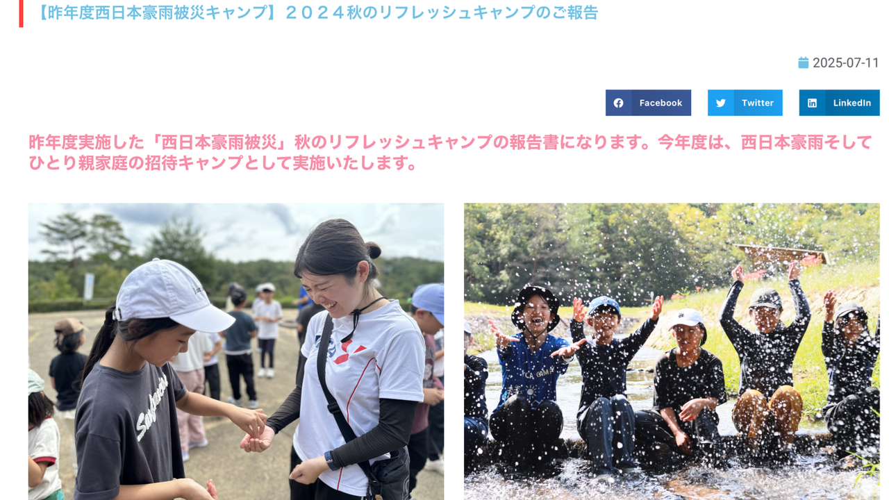 YMCAせとうちは、こども希望基金を創設し、経済的困難状況にあるこどもたちをYMCAが実施するさまざまな活動にご招待しています。特に2018年に起きた西日本豪雨災害では、災害発生の2ヶ月後に、災害を経験したこどもたちのために、リフレッシュキャンプを実施し、それから毎年、宿泊キャンプやデイキャンプにこどもたちを招待しています。