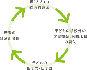 このようにして突然襲ってきた経済的困窮状況は、子どもたちから学習の機会やさまざまな体験活動の機会を奪うことにつながります。そのような教育機会に恵まれなかったことで低学力・低学歴になってしまった子どもは、大きくなったときに所得の低い職業につかざるを得なくなり、更には彼らの下の世代にもこの貧困が連鎖してしまうのです。