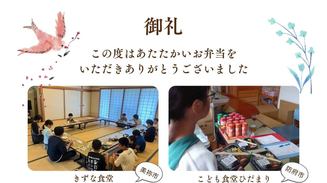 「丸久応援弁当」プロジェクトへの温かいご支援、誠にありがとうございました。皆様のご協力により、山口県内のこども食堂や子どもの居場所で、多くの子どもたちにお弁当を届けることができました。