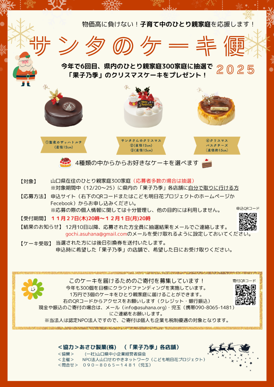 県内各地で「果子乃季(かしのき)」(25店舗)を運営されている㈱あさひ製菓(柳井市)に協力していただきます。今年は「聖夜のザッハトルテ」「サンタさんのクリスマス(12cm・15cm)」「クリスマス・バスクチーズ」の中から選んでもらいます(300家庭)。
