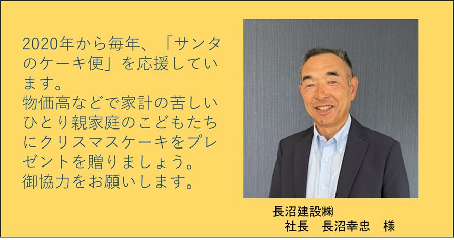 長沼建設㈱(防府市)の長沼幸忠社長様は、1年目から毎年、「サンタのケーキ便」に御寄付いただいています。「今年も応援します!もっと多くの皆さんからの御協力がいただけるよう、しっかりPRしましょう!」と励ましていただきました。多くの方に知っていただき、一緒に楽しいクリスマスを過ごせるように、御協力をお願いしていきたいと思います。