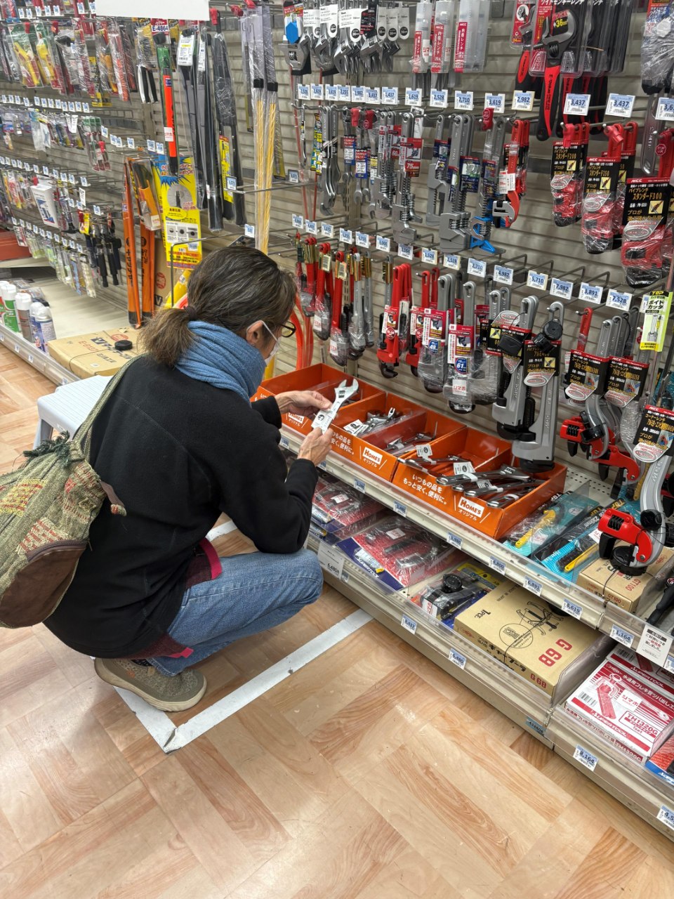 家具・家電の購入を始めました!この日は、ホームセンターへでかけました。家具や収納などの多くは、質の高いものを購入できるように組立などは自分たちで行い費用を抑えたいと思っています。必要な工具を探したり、建物内での取り換えが必要な部品を探したりしました。今回の写真は工具を真剣に選ぶスタッフです。お家のちょっとしたことを修理することが得意なスタッフがいるのは心強いです♪