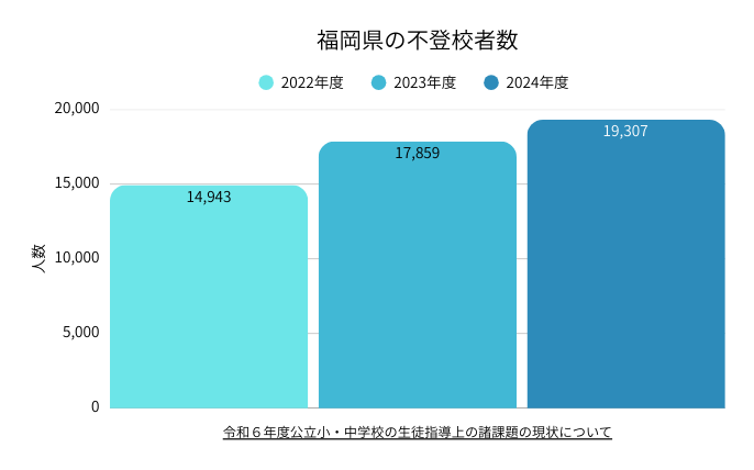 福岡県における2024年度の小中学生の不登校者数は19,307 人となっています。これは前年度17,859人からおよそ2,000人も増えています。よつばでも、2026年2月現在、入級者数は29人となっています。