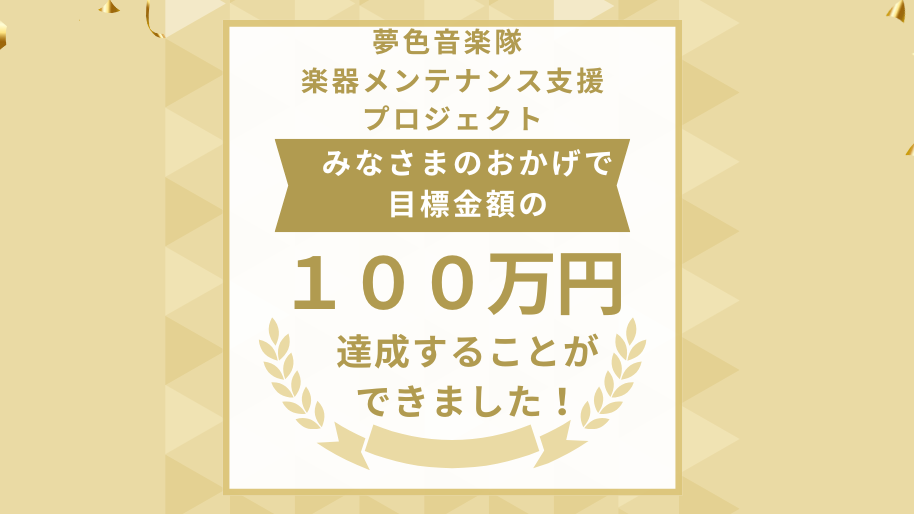 2025-12-19 21:35ご報告と御礼🎶🌈:目標金額達成しました!!心より御礼申し上げます。おかげさまで 夢色音楽隊「楽器メンテナンス支援プロジェクト」は、 目標金額100万円を達成することができました。 本当にありがとうございます。 子どもたち一人ひとりが大切に使ってきた楽器を、「もっと良い状態で演奏させてあげたい」その想いに、これほど多くの方が応えてくださったことに、感謝の気持ちで胸がいっぱいです。 今回のクラファンを通して、ご寄付くださった皆さま、町内会の皆さま、地域の皆さまとのあたたかなつながりと絆を強く感じました。 そして八木山という地域に支えられて、夢色音楽隊は活動できています。 これからも夢色音楽隊は、子どもたち全員で心をひとつに、 感謝の気持ちを音に込めて、素敵な演奏をお届けしてまいります🎷🌈 また本クラウドファンディングは、12/26まで締切のため、もう少しだけ受付を続けさせていただきますがどうぞよろしくお願いいたします。2025-12-19 21:35ご報告と御礼🎶🌈:目標金額達成しました!!心より御礼申し上げます。おかげさまで 夢色音楽隊「楽器メンテナンス支援プロジェクト」は、 目標金額100万円を達成することができました。 本当にありがとうございます。 子どもたち一人ひとりが大切に使ってきた楽器を、「もっと良い状態で演奏させてあげたい」その想いに、これほど多くの方が応えてくださったことに、感謝の気持ちで胸がいっぱいです。 今回のクラファンを通して、ご寄付くださった皆さま、町内会の皆さま、地域の皆さまとのあたたかなつながりと絆を強く感じました。 そして八木山という地域に支えられて、夢色音楽隊は活動できています。 これからも夢色音楽隊は、子どもたち全員で心をひとつに、 感謝の気持ちを音に込めて、素敵な演奏をお届けしてまいります🎷🌈 また本クラウドファンディングは、12/26まで締切のため、もう少しだけ受付を続けさせていただきますがどうぞよろしくお願いいたします。