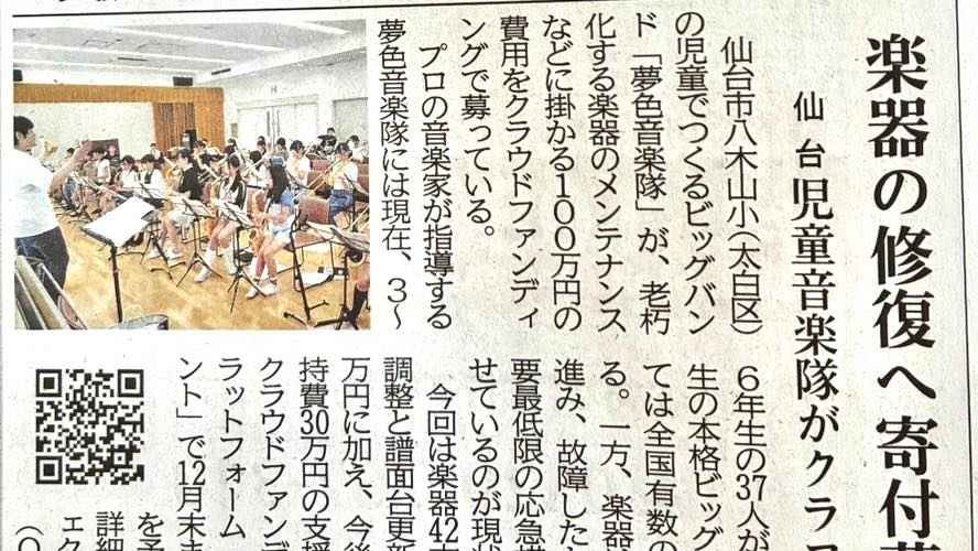2025-08-26 20:28本日(8/26)河北新報朝刊にて本クラファンを取り上げて頂きました。本日付 河北新報 朝刊にてクラウドファンディングについてご紹介いただきました。 子どもたちが全力で音楽に打ち込み、仙台でジャズを楽しみ続けられる環境を守るために、そして万全の状態の楽器で演奏させてあげたい――その想いで挑戦を続けています。 引き続き、温かいご支援とご協力をどうぞよろしくお願いいたします。2025-08-26 20:28本日(8/26)河北新報朝刊にて本クラファンを取り上げて頂きました。本日付 河北新報 朝刊にてクラウドファンディングについてご紹介いただきました。 子どもたちが全力で音楽に打ち込み、仙台でジャズを楽しみ続けられる環境を守るために、そして万全の状態の楽器で演奏させてあげたい――その想いで挑戦を続けています。 引き続き、温かいご支援とご協力をどうぞよろしくお願いいたします。