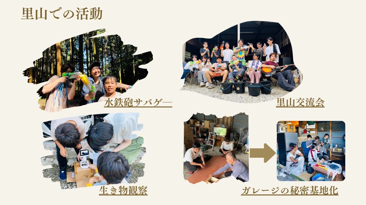 ①若い世代による、荒廃した里山の整備→里山を舞台とした、中高生教育カリキュラムの開発