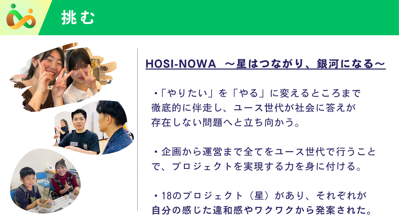 様々な社会問題や地域課題を取り上げ、体験できる「きっかけ」をつくることで、自分に合った社会活動の形を一緒に探していきます。