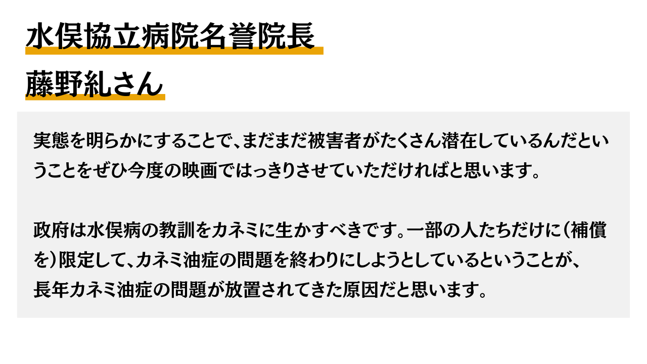 水俣協立病院名誉院長藤野糺さんからも、水俣病とカネミ油症の違いを踏まえ、本プロジェクトに対する応援メッセージをいただきました。